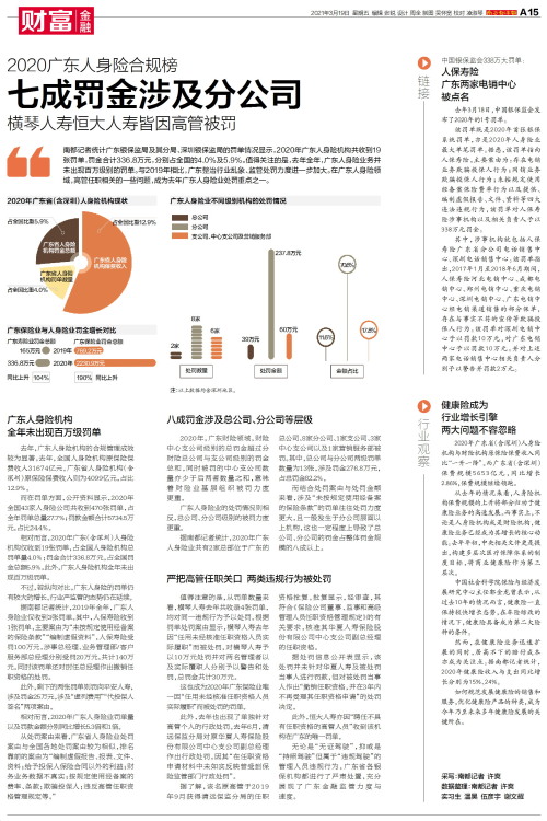 南都记者统计广东银保监局及其分局、深圳银保监局的罚单情况显示,2020年广东人身险机构共收到19张罚单,罚金合计336.8万元,分别占全国的4.0%及5.9%。值得关注的是,去年全年,广东人身险业务并
