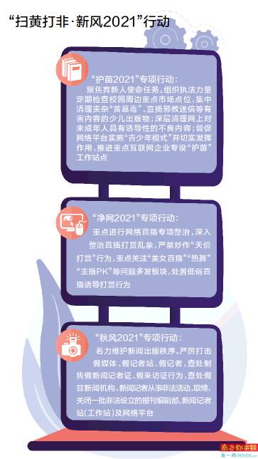 全国“扫黄打非”办公室负责人介绍,“新风”行动将以“护苗2021”“净网2021”“秋风2021”专项行动为开展平台。“护苗”行动聚焦育新人使命任务。一方面,组织执法力量定期检查校园周边重点市场点位,集中清理夹杂“黄暴毒”、宣扬邪教迷信等有害内容的少儿出版物;深层清理网上对未成年人具有诱导性的不良内容;督促网络平台实施“青少年模式”并切实发挥作用,推进重点互联网企业专设“护苗”工作站点。另一方面,打造“护苗”品牌,开展“护苗”系列正面宣传教育活动,打造“护苗”教育基地,推动学校、家庭严格管理学生使用手机等智能终端产品。
