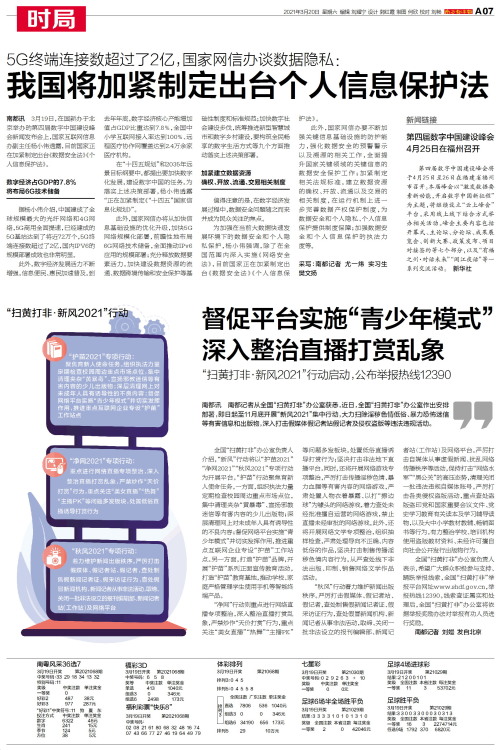 南都讯 3月19日,在国新办于北京举办的第四届数字中国建设峰会新闻发布会上,国家互联网信息办副主任杨小伟透露,目前国家正在加紧制定出台《数据安全法》《个人信息保护法》。数字经济占GDP的7.8%将布局