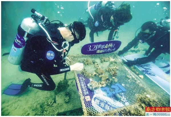 昨日是世界森林日,来自深圳的志愿者在深圳大鹏金沙湾海域举行“珊瑚扶植”活动。10名志愿者下海清理垃圾,收集珊瑚残肢并固定在特定区域的苗圃上。未来,这些珊瑚稳定成长并恢复生机后,将会被放回海底的礁石上,此次活动旨在呼吁关注“海底森林”——珊瑚礁,加强公众对海洋生态的保护意识。 新华社发