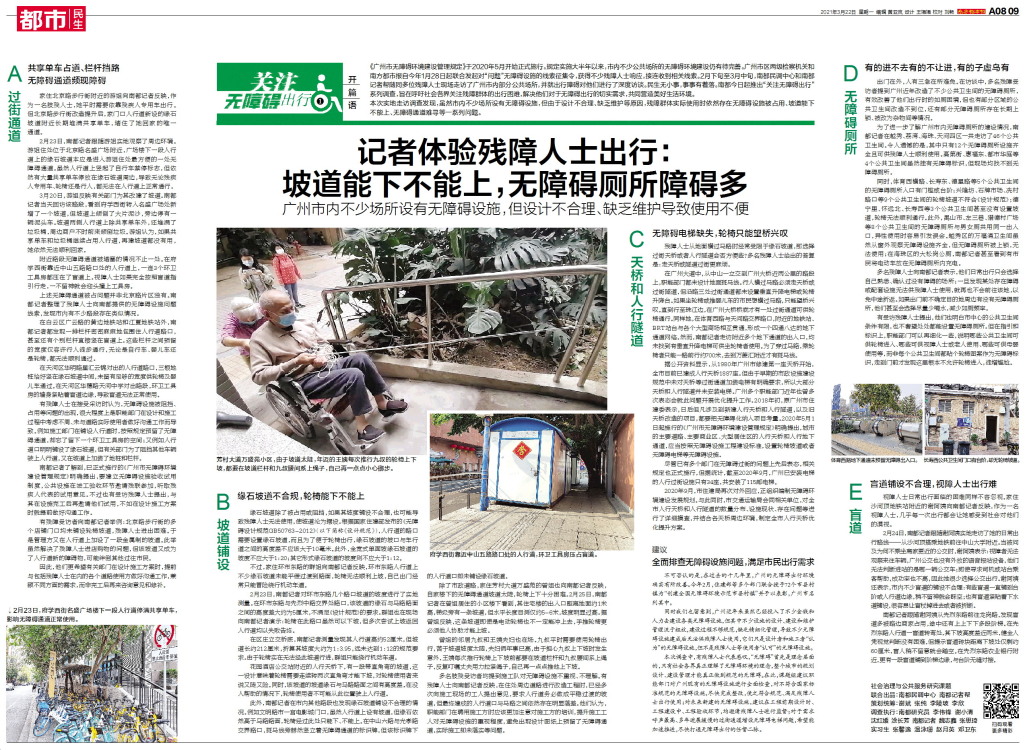 开篇语《广州市无障碍环境建设管理规定》于2020年5月开始正式施行。规定实施大半年以来,市内不少公共场所的无障碍环境建设仍有待完善。广州市区两级检察机关和南方都市报自今年1月28日起联合发起对“问