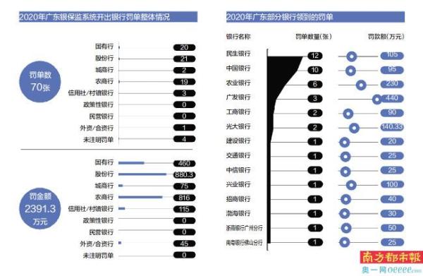 去年全年,广东银保监局及各个分局总共开出70张罚单,罚款金额达到2391.3万元。