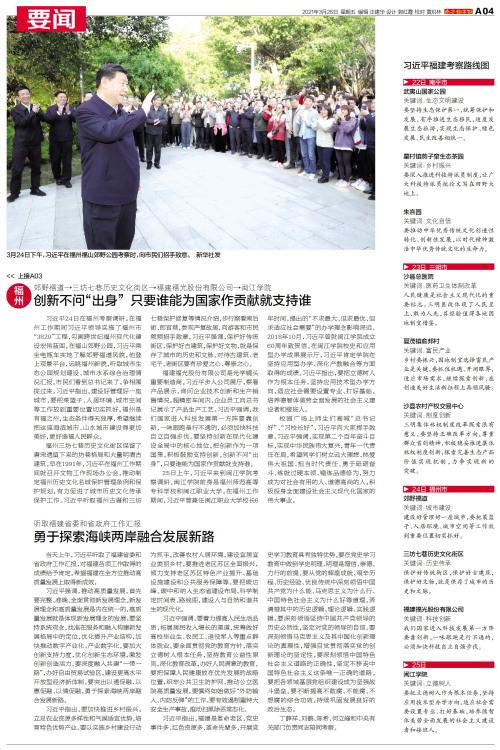 新华社福州3月25日电 中共中央总书记、国家主席、中央军委主席习近平近日在福建考察时强调,要落实党中央决策部署,坚持稳中求进工作总基调,立足新发展阶段、贯彻新发展理念、构建新发展格局,深化供给侧结构性