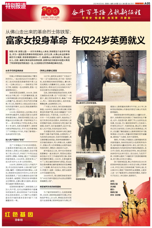 铁军小学、铁军公园……对于许多佛山人来说,陈铁军这个名字并不陌生。作为一座具有优良革命传统的城市,近代以来,从佛山走出的革命英烈不计其数,陈铁军便是其中一个,她被佛山人亲切地称为:佛山的女儿。日前,南