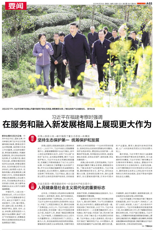 新华社福州3月25日电 中共中央总书记、国家主席、中央军委主席习近平近日在福建考察时强调,要落实党中央决策部署,坚持稳中求进工作总基调,立足新发展阶段、贯彻新发展理念、构建新发展格局,深化供给侧结构性