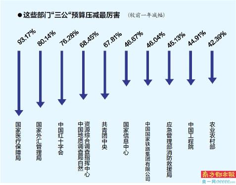 从102个中央部门的预算安排来看,有87个部门“三公”经费预算下降。其中有10个部门的“三公”经费压缩幅度超过40%,66个部门压缩“三公”经费幅度为10%以下。去年,在大幅压减“三公”经费的背景下,大多数部门“三公”经费压缩幅度超过10%,仅有3个部门在10%以下。