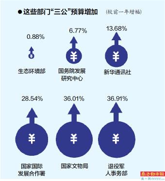 还有6个部门“三公”经费增加,分别是国家文物局、新华社、退役军人事务部、国家国际发展合作署、国务院发展研究中心、生态环境部。