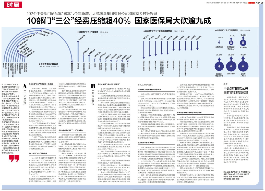 在“过紧日子”背景下,中央部门如何花钱?3月25日,102家中央部门集中公布2021年度部门预算,晒出“账本”。据统计,今年中央本级“三公”经费连续第10年下降,较去年下降6%。有87个部门“三公”经