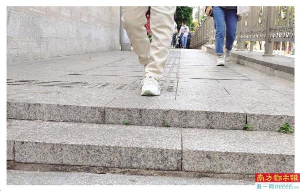 “我从地铁站出来要经过这里,想走盲道又不敢走。”谢姐向记者分享她的危险经历,“盲道离下面的台阶太近,走的时候万一摔倒了就容易掉下去。好几次走这里,被路人撞到差点摔下阶梯。”她希望有关部门能将盲道调整到北侧栏杆附近,这样既能扶着栏杆走,也可以安全使用盲道。