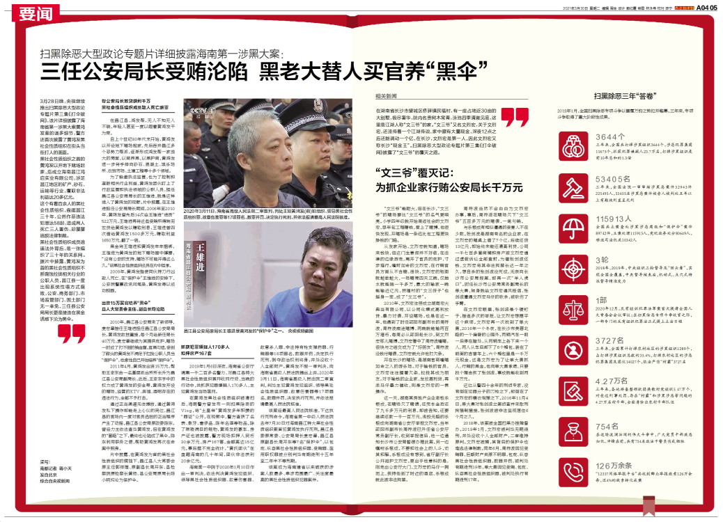 3月28日晚,央视继续推出扫黑除恶大型政论专题片第三集《打伞破网》,该片详细披露了海南省第一涉黑大案黄鸿发案的诸多细节,警方还首次披露了黄鸿发黑社会性质组织在街头当街打人的画面。黑社会性质组织之首的黄