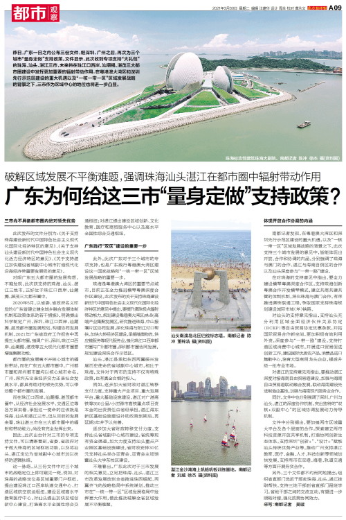 昨日,广东一日之内公布三份文件,继深圳、广州之后,再次为三个城市“量身定做”支持政策。文件显示,此次收到专项支持“大礼包”的珠海、汕头、湛江三市,未来将在珠江口西岸、汕潮揭、湛茂三大都市圈建设中发挥更