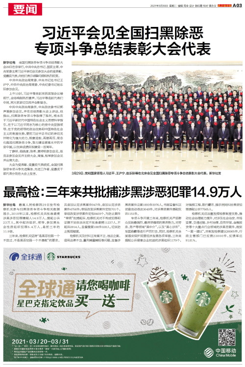 习近平会见全国扫黑除恶专项斗争总结表彰大会代表