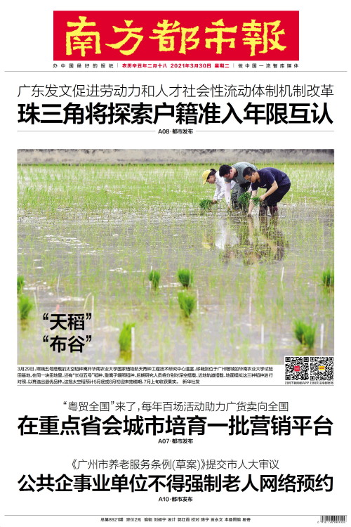 3月29日,嫦娥五号搭载的太空稻种离开华南农业大学国家植物航天育种工程技术研究中心温室,移栽到位于广州增城的华南农业大学试验田基地。在同一块田地里,还有“长征五号”稻种、重离子辐照稻种,后期研究人员将