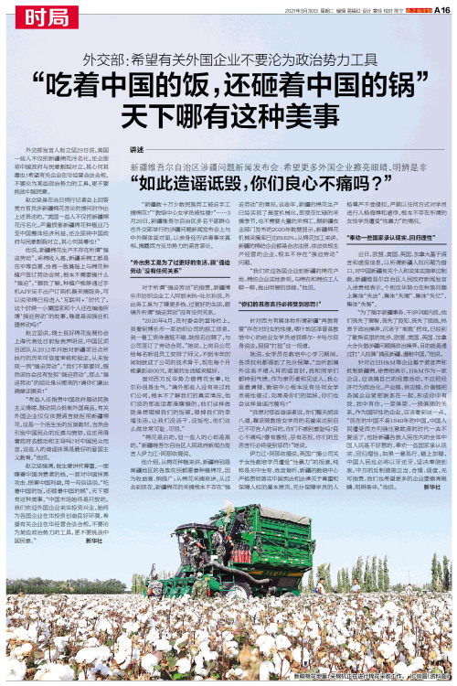 外交部发言人赵立坚29日说,美国一些人不仅把新疆棉花污名化,还企图将中国政府与民意割裂对立,其心何其毒也!希望有关企业在华经营合法合规,不要沦为某些政治势力的工具,更不要挑战中国民意。赵立坚是在当日例