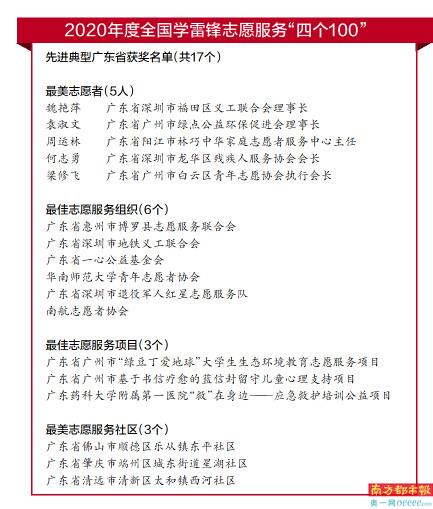 南都讯 记者钟丽婷 实习生钟梓悦 3月31日上午,中宣部、中央文明办在北京召开推进学雷锋志愿服务工作电视电话会议,会上公布了2020年度全国学雷锋志愿服务“四个100”先进典型名单。其中,广东5位志愿者、6个志愿服务组织、3个志愿服务项目、3个志愿服务社区入选2020年度全国学雷锋志愿服务“四个100”先进典型。