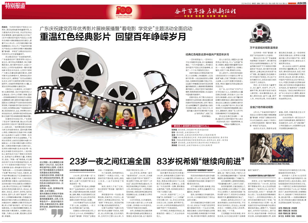 南都讯 为庆祝中国共产党成立100周年,更好发挥电影特殊重要作用,大力营造共庆百年华诞、共创历史伟业的浓厚氛围,国家电影局近日印发了《关于开展庆祝中国共产党成立100周年优秀影片展映展播活动的通知》,