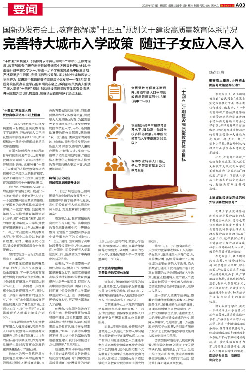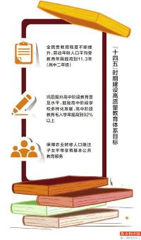“十四五”末我国人均受教育水平要达到高中二年级以上教育程度。教育部将专门研究制定县域普通高中发展提升行动计划,全面提升县中的办学水平。将进一步科学编制普通高中招生计划,严格规范招生范围,完善指标到校政