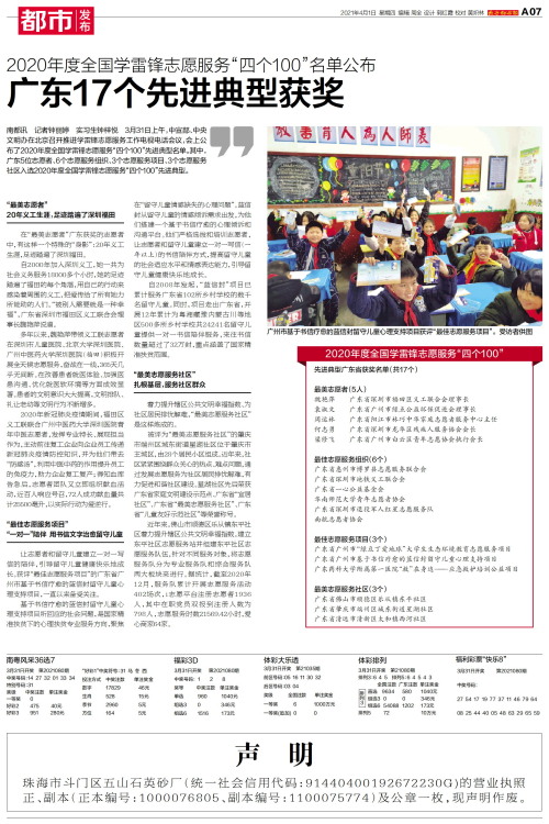 南都讯 记者钟丽婷 实习生钟梓悦 3月31日上午,中宣部、中央文明办在北京召开推进学雷锋志愿服务工作电视电话会议,会上公布了2020年度全国学雷锋志愿服务“四个100”先进典型名单。其中,广东5位志愿