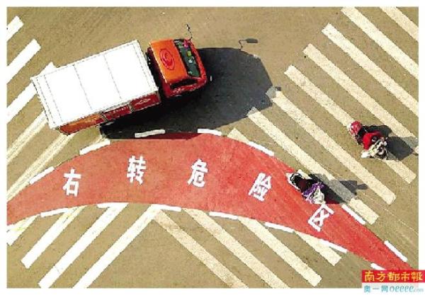 日前,广州黄埔区开创大道与骏功路十字路口,在右转区域铺装红色沥青同时地面施画“危险区域”字样,这是咋回事?昨日,微信公众号“广东交警”有回应了。原来,这是针对货运物流、工业企业集中、大型货车占比较高及高峰期间行人过街需求大的路段,为妥善规避大货车的视野盲区,广州、汕头等地交警出的“新招”。由于大型车辆右转弯时的内轮差(前内轮转弯半径与后内轮转弯半径之差)的存在,前、后车轮的运动轨迹不重合,加上司机的视野盲区,就造成了“死亡弯月”。