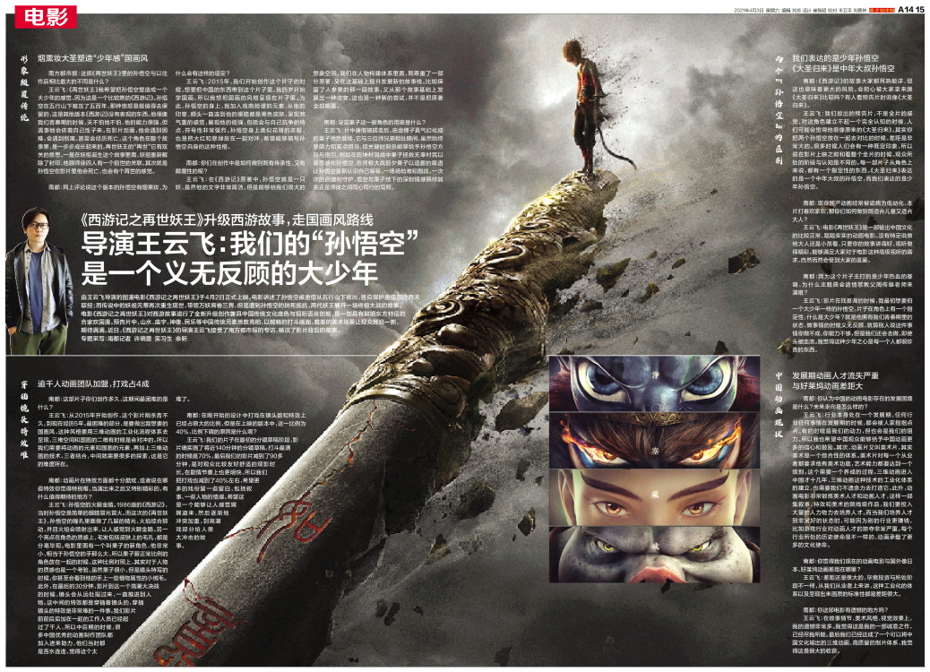 电影《西游记之再世妖王》对西游故事进行了全新升级创作兼具中国传统文化底色与视听语言创新,是一部具有鲜明东方特征的合家欢国漫。预告片中,山水、庙宇、神像、民乐等中国传统元素悉数亮相,以酣畅的打斗画面、唯美的美术场景让观众耳目一新,期待满满。近日,《西游记之再世妖王》的导演王云飞接受了南方都市报的专访,畅谈了影片背后的故事。