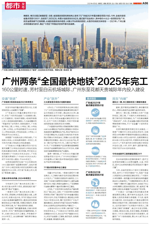 《广东省2021年重点建设项目计划》中,涉及广州的项目涵盖了13条高速公路、6个交通枢纽、7条城市道路、9条城际铁路以及11条地铁线路的建设,几大备受瞩目的“明星项目”位列其中。地铁线路中,广州地铁7号线二期、11号线、13号线二期、14号线二期、18号线、22号线明确将于2022年完工;3号线东延段、5号线东延段、10号线、12号线将于2023年完工。