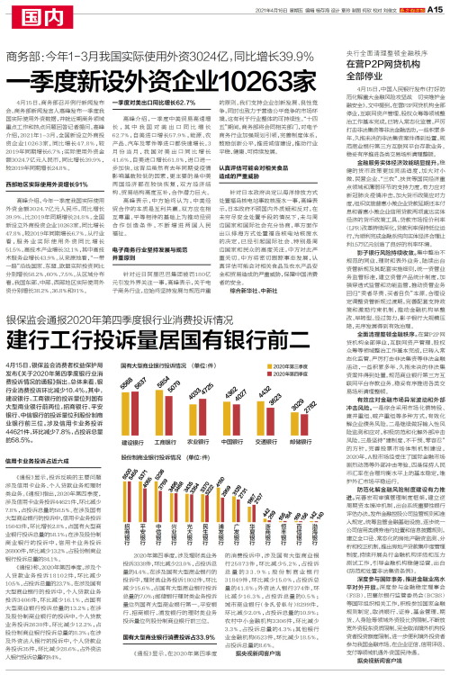 4月15日,银保监会消费者权益保护局发布《关于2020年第四季度银行业消费投诉情况的通报》指出,总体来看,银行业消费投诉环比减少10.4%。其中,建设银行、工商银行的投诉量位列国有大型商业银行前两