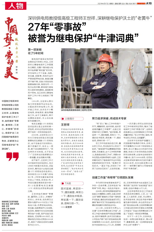 人物简介 王世祥 中国南方电网深圳供电局有限公司继保检修专责、技术专家、教授级高级工程师,王世祥劳模创新工作室技术带头人。出版专业技能培训书籍4本,发行15000余册。在危险点控制领域申请专利
