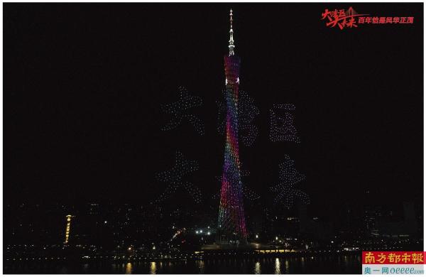 4月19日晚,无人机天幕光影秀在广州海心沙上演。1000架无人机用科技的方式,讲述粤港澳大湾区的故事。 南都记者 李孟麟 摄