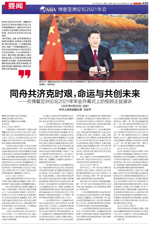 (2021年4月20日,北京)中华人民共和国主席 习近平 新华社北京4月20日电 博鳌亚洲论坛2021年年会开幕式20日上午在海南博鳌举行,国家主席习近平以视频方式发表题为《同舟共济克时艰,命运与共