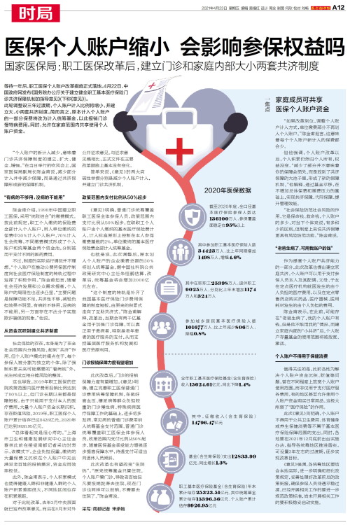 等待一年后,职工医保个人账户改革措施正式落地。4月22日,中国政府网发布《国务院办公厅关于建立健全职工基本医疗保险门诊共济保障机制的指导意见》(下称《意见》)。此轮调整设三年过渡期,个人账户计入比例将