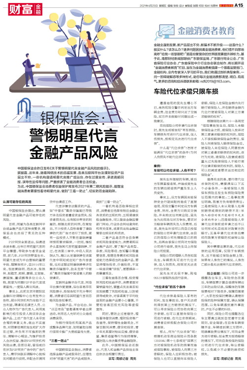 中国银保监会昨日发布《关于警惕明星代言金融产品风险的提示》。据披露,近年来,随着网络技术的迅猛发展,各类互联网平台及理财投资产品层出不穷,一些机构邀请明星代言推广或站台,存在过度宣传、承诺高额回报、误