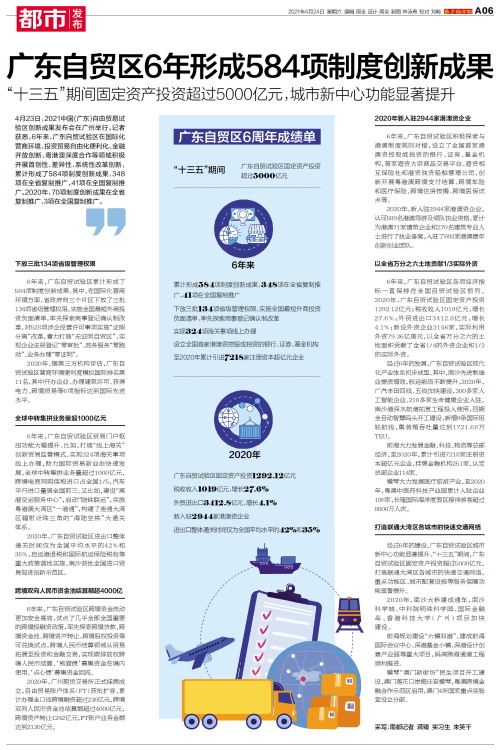 4月23日,2021中国(广东)自由贸易试验区创新成果发布会在广州举行。记者获悉,6年来,广东自贸试验区在国际化营商环境、投资贸易自由化便利化、金融开放创新、粤港澳深度合作等领域积极开展首创性、差