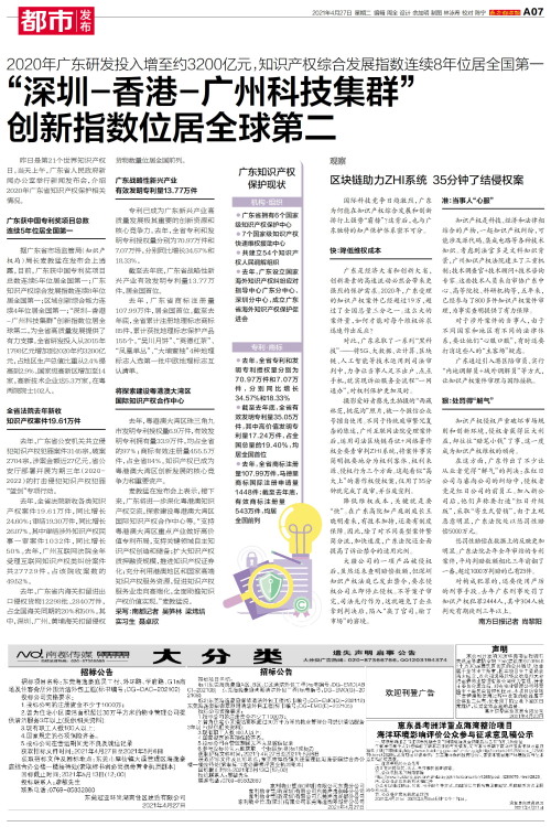 昨日是第21个世界知识产权日。当天上午,广东省人民政府新闻办公室举行新闻发布会,介绍2020年广东省知识产权保护相关情况。广东获中国专利奖项目总数连续5年位居全国第一据广东省市场监管局(知识产权局)局