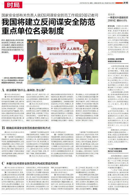 昨日,国家安全部公布《反间谍安全防范工作规定》,并自公布之日起施行。国家安全部有关负责人就《反间谍安全防范工作规定》的有关问题回答了记者的提问。A 依法明确“防什么、谁来防、怎么防”问:为什么要制定规