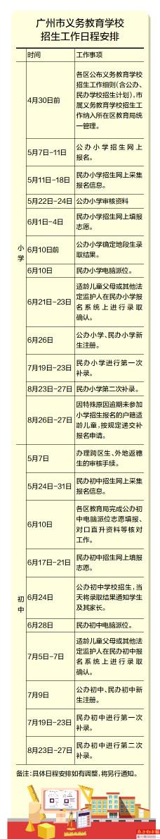 4月26日,广州市教育局印发《广州市义务教育学校招生工作指导意见的通知》(简称《指导意见》)。《指导意见》明确,严禁学校以考试或任何变相考试形式进行招生;全面取消义务教育学校各类特长生招生;每所划片入学的公办初中95%以上的生源由就近入学方式确定;公办小学非正常跨区域招生比例必须控制在5%以下,并逐年减少。