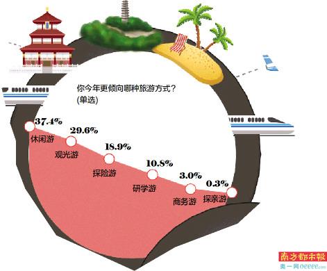 从旅行方式来看,近七成受访者选择休闲游和观光游,分别占37.4%和29.6%。不少受访者表示,自己平时上班压力很大,好不容易盼到假期,想放松一下,更倾向于选择休闲游和观光游。18.9%的受访者更愿意选择具有冒险精神的探险游,还有10.8%的受访者想体验一次研学游。
