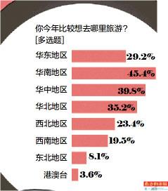 就旅游目的地而言,近五成受访者最想去华南地区旅游;其次是华中地区,占39.8%;华北地区的热度也不低,35.2%的受访者想去华北旅游。