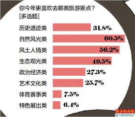 具体到旅游景点,自然风光类的热度最高,占60.5%;56.2%的受访者对不同地区的风土人情颇有兴趣;生态观光类、历史遗迹类也备受欢迎,分别占49.5%、31.8%。