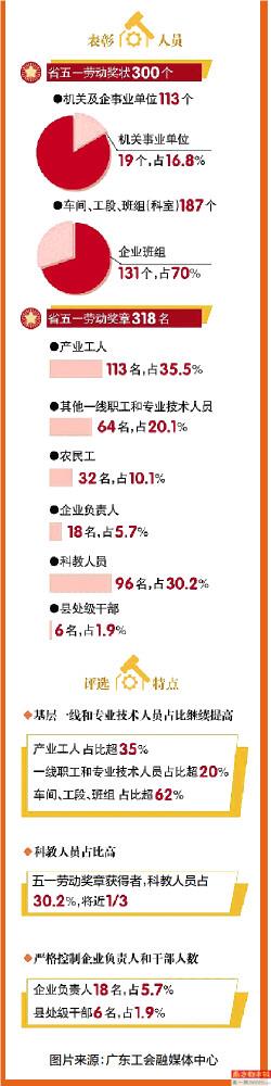 南都讯 记者郑雨楠 4月29日上午,广东省庆祝“五一”国际劳动节暨劳模表彰大会在广州举行,隆重表彰300个获得广东省五一劳动奖状单位和318名获得广东省五一劳动奖章职工。今年,广东省五一劳动奖继续向基层一线倾斜,在省五一劳动奖状中,来自车间、工段、班组(科室)的187个,占比过半;省五一劳动奖章中,产业工人113名,占比35.5%。