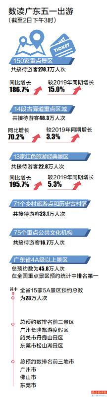 据悉,省文旅厅继续推广重点景区场馆预约游览,截至2日下午3时,我省4A级以上景区总预约数为45.8万人次,在全国重点景区预约统计中排名第一;其中全省15家5A景区预约总数为23万人次,前三名分别是广州长隆旅游度假区、韶关市丹霞山景区、东莞市松山湖景区,总预约数排名前三的地市分别是广州市、佛山市和东莞市。