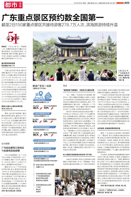 南都讯 5月2日,是“五一”假期第二天,初夏舒适宜游天气叠加小长假出游效应,文化旅游市场进一步恢复发展。据初步测算,截至2日下午3时,我省纳入监测的150家重点景区共接待游客278.7万人次。重点