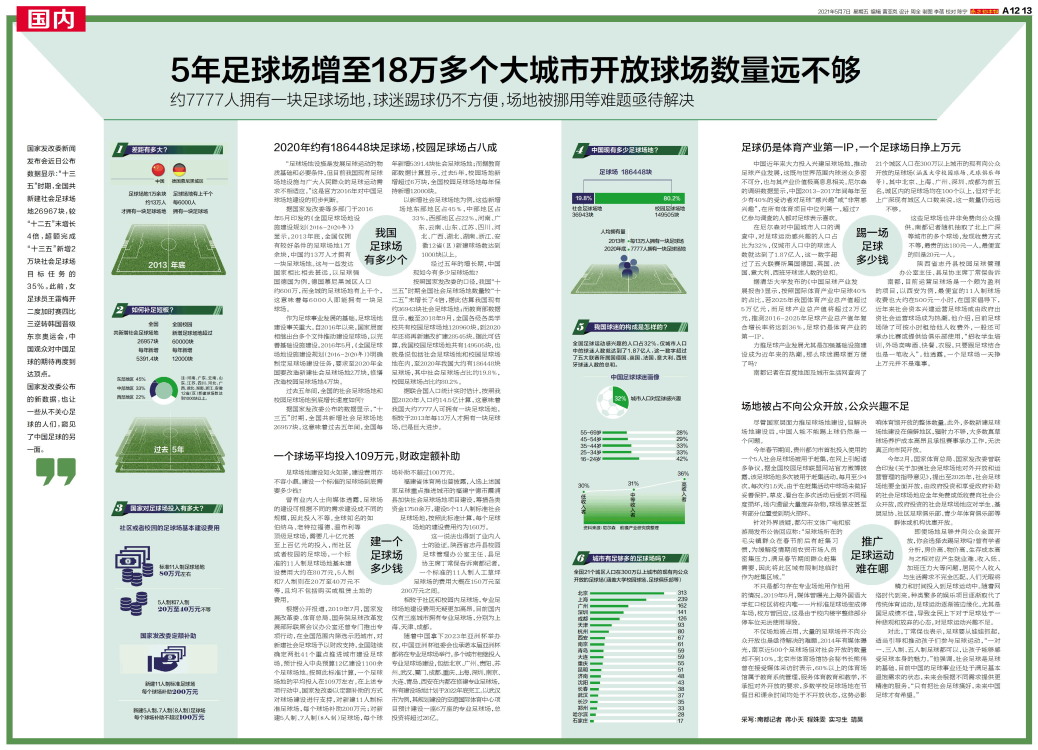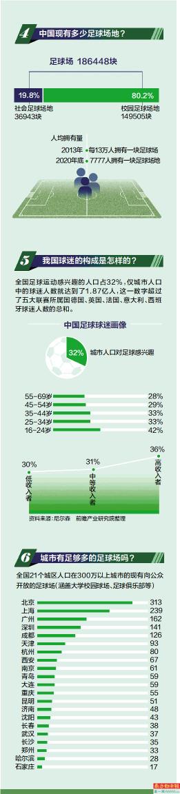 南都记者在百度地图及城市生活网查询了21个城区人口在300万以上城市的现有向公众开放的足球场(涵盖大学校园球场、足球俱乐部等),其中北京、上海、广州、深圳、成都为前五名,城区内的足球场均在100个以上,但对于北上广深现有城区人口数来说,这一数量仍远远不够。
