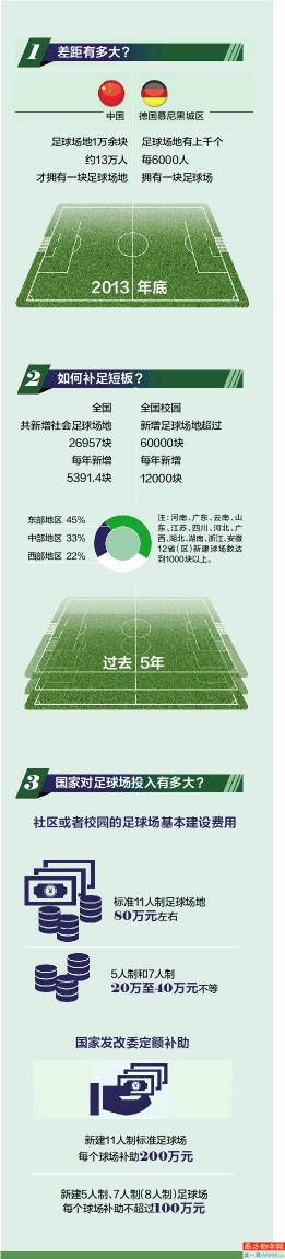 据国家发改委等多部门于2016年5月印发的《全国足球场地设施建设规划(2016-2020年)》显示,2013年底,全国仅拥有较好条件的足球场地1万余块,中国约13万人才拥有一块足球场地。这与一些发达国家相比相去甚远,以足球强国德国为例,德国慕尼黑城区人口约600万,而全城的足球场地有上千个,这意味着每6000人即能拥有一块足球场。