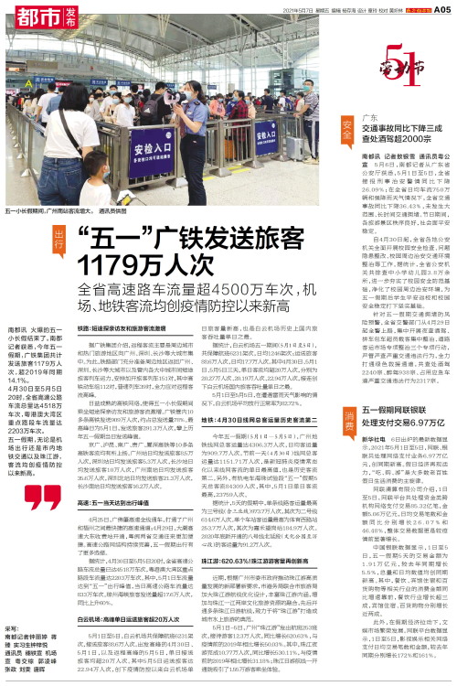 出行 南都讯 火爆的五一小长假结束了。南都记者获悉,今年五一假期,广铁集团共计发送旅客1179万人次,超2019年同期14.1%。4月30日至5月5日20时,全省高速公路车流总量达4518万