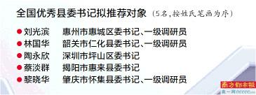 南都讯 南方日报记者 骆骁骅 5月6日,广东省委组织部发布《关于全国优秀县委书记拟推荐对象的公示》,确定广东省5名全国优秀县委书记拟推荐对象,分别是惠州市惠城区委书记刘光滨、韶关市仁化县委书记林国华、深圳市坪山区委书记陶永欣、揭阳市惠来县委书记蔡淡群、肇庆市怀集县委书记黎晓华。公示时间为2021年5月7日至12日。
