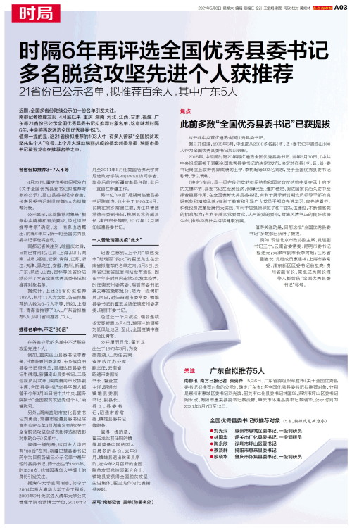 近期,全国多省份陆续公示的一份名单引发关注。南都记者梳理发现,4月底以来,重庆、湖南、河北、江西、甘肃、福建、广东等21省份已公示全国优秀县委书记拟推荐对象名单。这意味着时隔6年,中央将再次遴选全国优