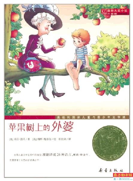 有一本书,我特别喜欢。封面上有一棵结满果实的苹果树,树上一位乐呵呵的老太太戴着一顶插着羽毛的宽檐帽,正拿着一个苹果递给一旁羞涩的小男孩。它奇妙的名字《苹果树上的外婆》让我对这本书一见钟情。外婆为什么会在苹果树上?他们为什么在苹果树上见面?