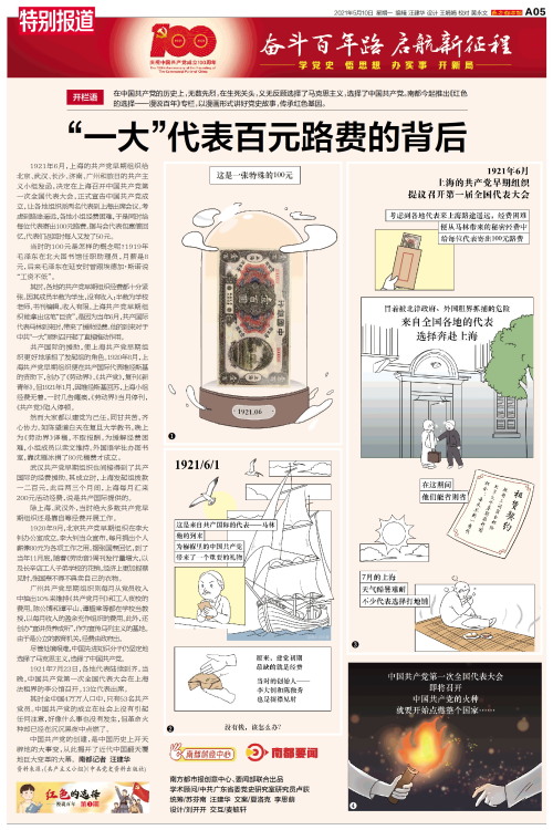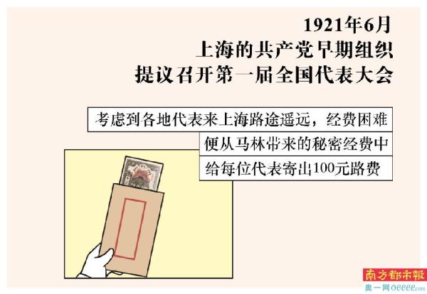 1921年6月,上海的共产党早期组织给北京、武汉、长沙、济南、广州和旅日的共产主义小组发函,决定在上海召开中国共产党第一次全国代表大会,正式宣告中国共产党成立,让各地组织派两名代表到上海出席会议。考虑到路途遥远,各地小组经费困难,于是同时给每位代表寄出100元路费。据与会代表包惠僧回忆,代表们返回时每人又发了50元。