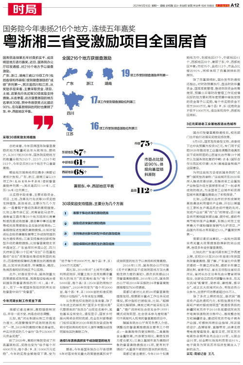 国务院连续第五年对真抓实干、成效明显地方进行嘉奖。近日,国务院办公厅印发通报,对216个地方予以督查激励。广东、浙江、湖南三省以19项工作(包括省级和市县级)受到督查激励的“成绩”并列第一,其次是