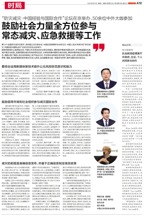 第13个全国防灾减灾日前夕,由中国公共关系协会、中国应急管理学会共同主办,中国人民大学承办的“防灾减灾:中国经验与国际合作”论坛5月9日在北京举行。国务院新闻办公室原副主任、中国公共关系协会会长郭